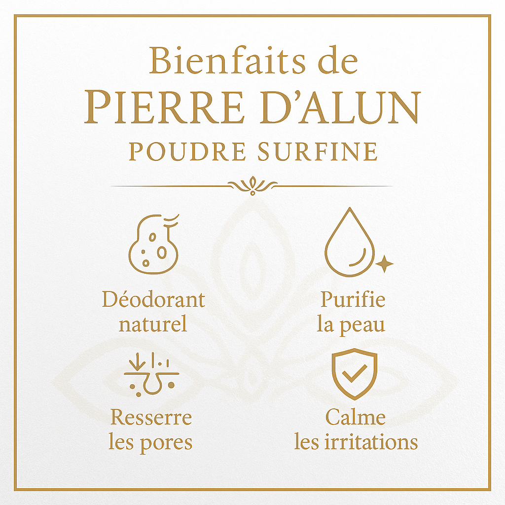 La pierre d'alun poudre surfine offre en effet une alternative naturelle aux déodorants conventionnels. Grâce à ses propriétés, elle aide notamment à réguler la transpiration sans obstruer les pores.